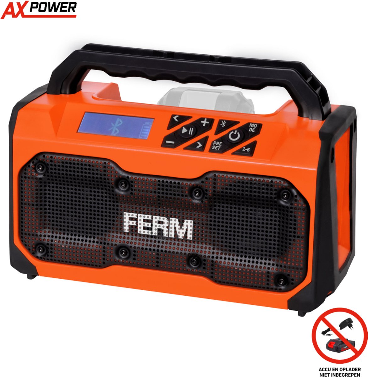 Bol.com | FERM - AX-POWER - JRM1005 - Bouw radio - Bluetooth radio - FM radio - USB oplaadpoort - Stereo - 2x 15W - Draagbaar - Werkt op 20V AX of FX accu [apart verkrijgbaar] - Geschikt voor de werkplaats - Bouwvakker radio - Powerbank functie - Jobsite radio |