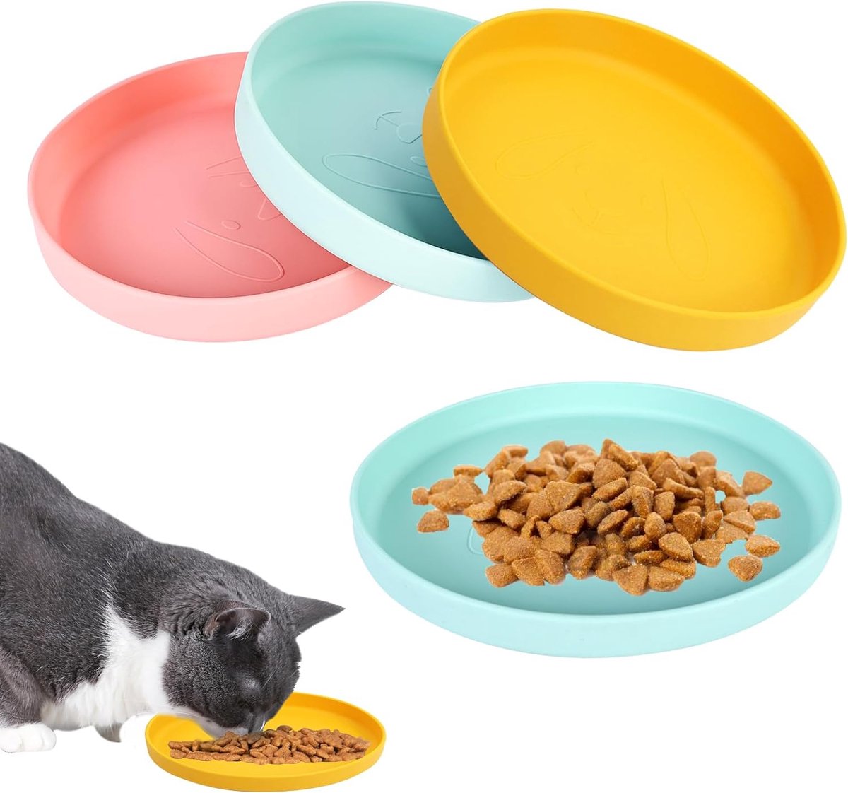 Bol.com | Voederbak voor katten, 3-delige set, kleurrijke kattenbakken, voederschaal, platte kattenbak, siliconen bak, brede drinkschaal, kattenkom voor droogvoer en nat voer, waterbak |