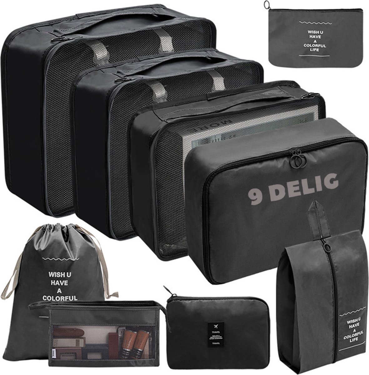 Bol.com | Coverzs Packing Cubes set 9 delig (zwart) - Kleding organizer set voor koffer & backpack - Backpack organizerset - 9 delige organizer set inclusief toilettas - Kleding organizer |