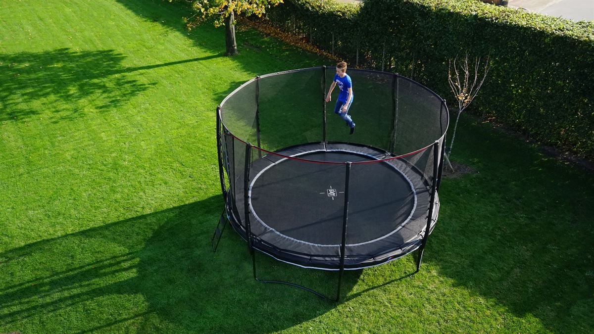 De EXIT PeakPro trampoline met veiligheidsnet is een trampoline met een matzwarte beschermrand en eersteklas springcomfort. Het zwarte frame, subtiele kleurdetails en reflecterende biezen geven de grote trampoline een robuuste uitstraling. Deze trampoline wordt geleverd met een ladder, zodat je veilig en snel op de trampoline kunt klimmen. De PeakPro trampolines zijn geschikt voor kinderen met veel springervaring. De flexibele springveren van de EXIT PeakPro trampoline zijn maar liefst 25 centimeter lang en maken het gemakkelijk om tot grote hoogte te springen. Het standaard veiligheidsnet is voorzien van een springblad, zodat iedereen kan zien hoe hoog je kunt springen. Het trampolineframe is gegalvaniseerd en voorzien van een poedercoating om roestvorming te voorkomen. Bovendien zijn de voeten en de bovenbuis zeer stabiel, zodat de trampoline op zijn plaats blijft tijdens de wildste sprongen. Het hoogwaardige veiligheidsnet en de robuuste beschermrand van de PeakPro beschermen je bij een misstap. En het speciale voetbeschermingssysteem zorgt ervoor dat je bij het springen niet met je voeten tussen de veren komt te zitten.