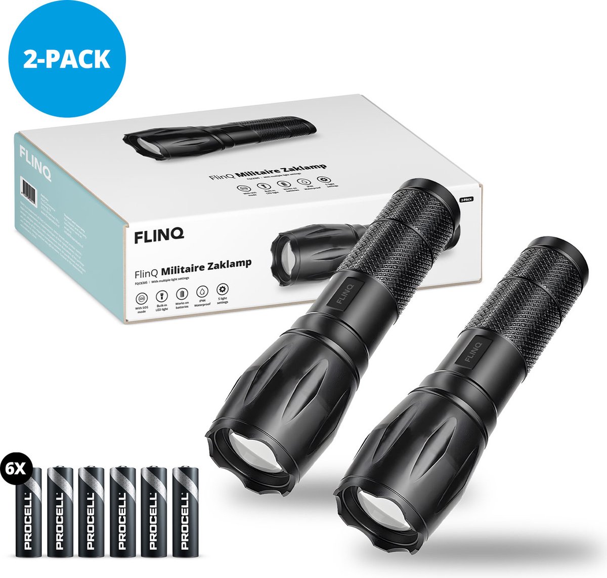 FlinQ Militaire Zaklamp + 6 Duracell Batterijen - Zaklamp Led - 1000 Meter - Aluminium - 2-pack - Zwart aanbiedingen