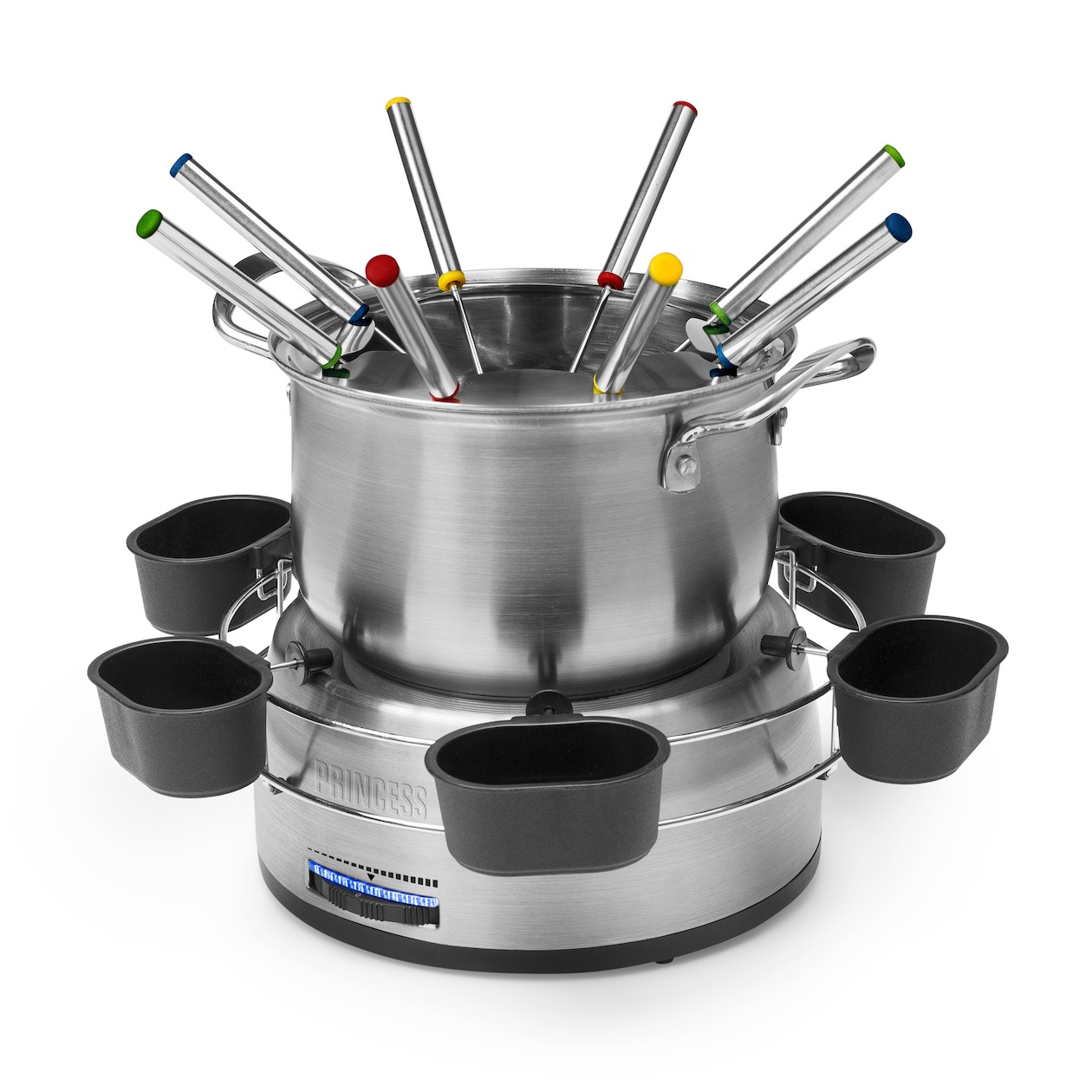 De Princess familie fondueset brengt het plezier van fonduen terug! De fonduepan heeft een ruime inhoud van 1.2 L! Dit maakt de Princess fondueset perfect voor traditionele Zwitserse kaasfondue, maar natuurlijk kan hij ook gebruikt worden voor een fondue bourguignonne met rode wijn of een heerlijke chocoladefondue. De spatbeschermring houdt de vorken op hun plaats en je kunt verschillende sauzen serveren in de praktische sausring. Ook zijn er 8 kleurgecodeerde roestvrijstalen fonduevorkjes bij, zodat je met de hele familie van een fonduefeest kunt genieten. De regelbare thermostaat met 800 W vermogen zorgt ervoor dat je steeds de optimale temperatuur kunt kiezen voor elke soort fondue. Dankzij de uitneembare fonduepan en ring is de set ook heel gemakkelijk schoon te maken.