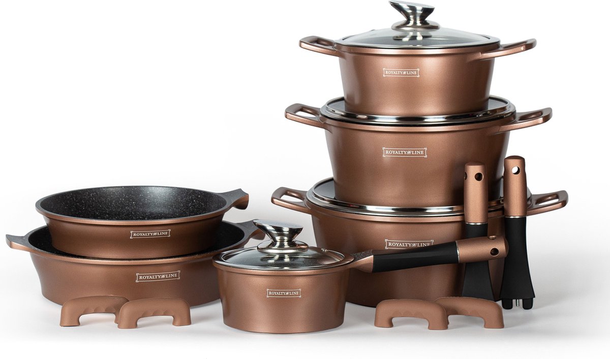 De Royalty Line® ES1014 Inductie Pannenset - 14-Delige Pannenset Met Marmeren Coating - Met Afneembare Handvaten - Oven-Ready - PFAS-Vrij - Voor Alle Warmtebronnen - Antiaanbaklaag - Met Glazen Deksels - Koper is op dit moment niet in de aanbieding.